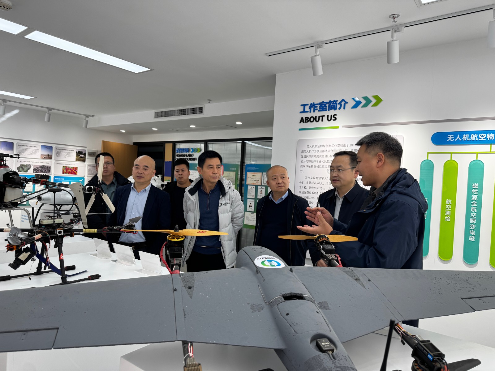 會(huì)前,王文飛一行實(shí)地參觀了二一四隊(duì)航空物探創(chuàng)新工作室展廳,詳細(xì)了解二一四隊(duì)在航空物探領(lǐng)域的技術(shù)積累、設(shè)備研發(fā)及成果轉(zhuǎn)化應(yīng)用成效,對(duì)其在物探技術(shù)創(chuàng)新方面的前瞻性探索與實(shí)踐成果給予高度認(rèn)可。